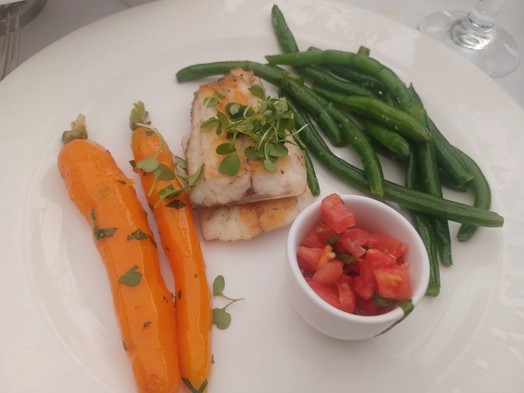 The set menu offers 8 appetizers, 8 entrées and 3 desserts – the usually suspects (steak, lobster, etc) have supplemental charges. We opt for Fried Shrimp / Eggplant Parmigiana, Chicken / Sea Bass, Eclair/ Fruit. We loved it all (I had to sneak the photos – really not the done thing!)