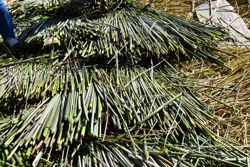 To build an island, the Uros first gather large blocks of totora roots – a remarkably strong and pliable endemic reed that is abundant in the lake. Multiple blocks are pulled together, the roots and reeds mixing naturally to form a layer about 1-2m thick. Reeds are continually laid on top of this floating base – a long scythe is used to cut the plant under water and the reeds are dried in the sun for a few weeks before being bundled and placed in alternating directions on top of the root blocks. Fresh reeds have to be added every few weeks as the lower layers rot – an endless cycle that has continued for centuries now. The islands support several housing structures which are also made from the reed. Eucalyptus rods are stuck into the bottom of the lake as anchors and the islands tethered to stop them drifting away (a family can move at any time – there is no claim to property rights on the lake). Each island lasts for about 30 years – at that stage the foundations are no longer of use and a new island must be built.