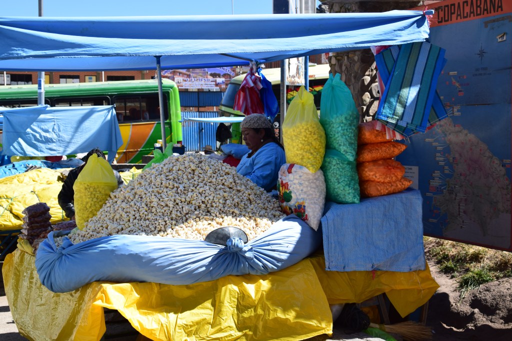 Copacabana is Bolivia’s equivalent of Puno – a jumping off spot for the islands. It’s wrong of me to compare the two when I didn’t spend any time at all in Puno but my initial impressions were of a far more attractive town – although much smaller. We’d just a short time to look at the Basilica and market before heading to the harbour to catch our boat for the one hour’s ride to Isla del Sol. There are nice coffee shops and plenty of places to eat and sleep and I, for one, would be happy to spend a night there.