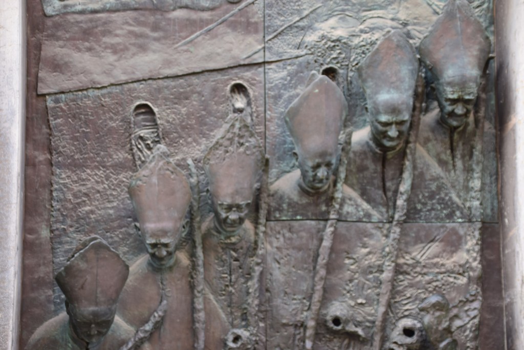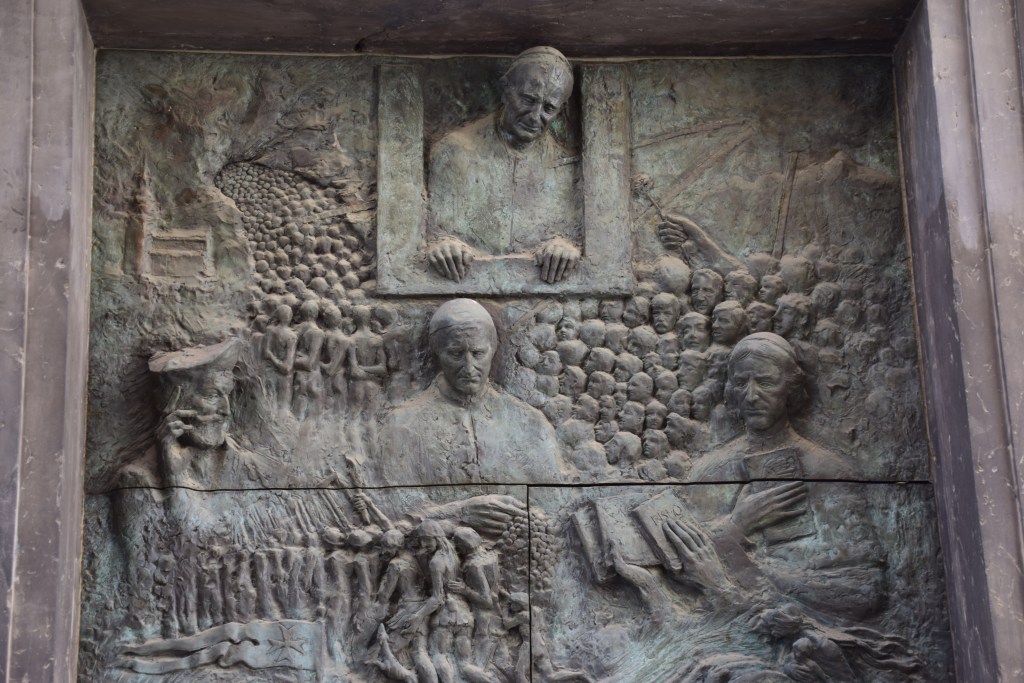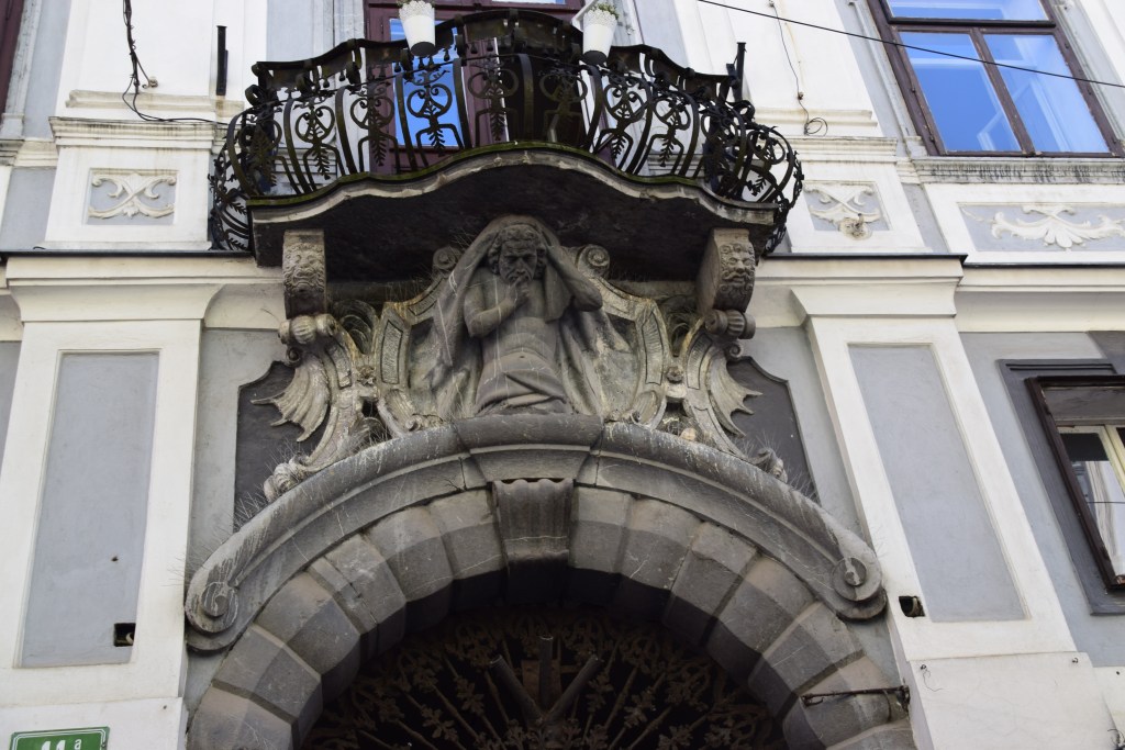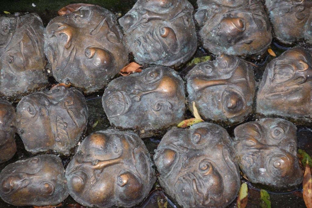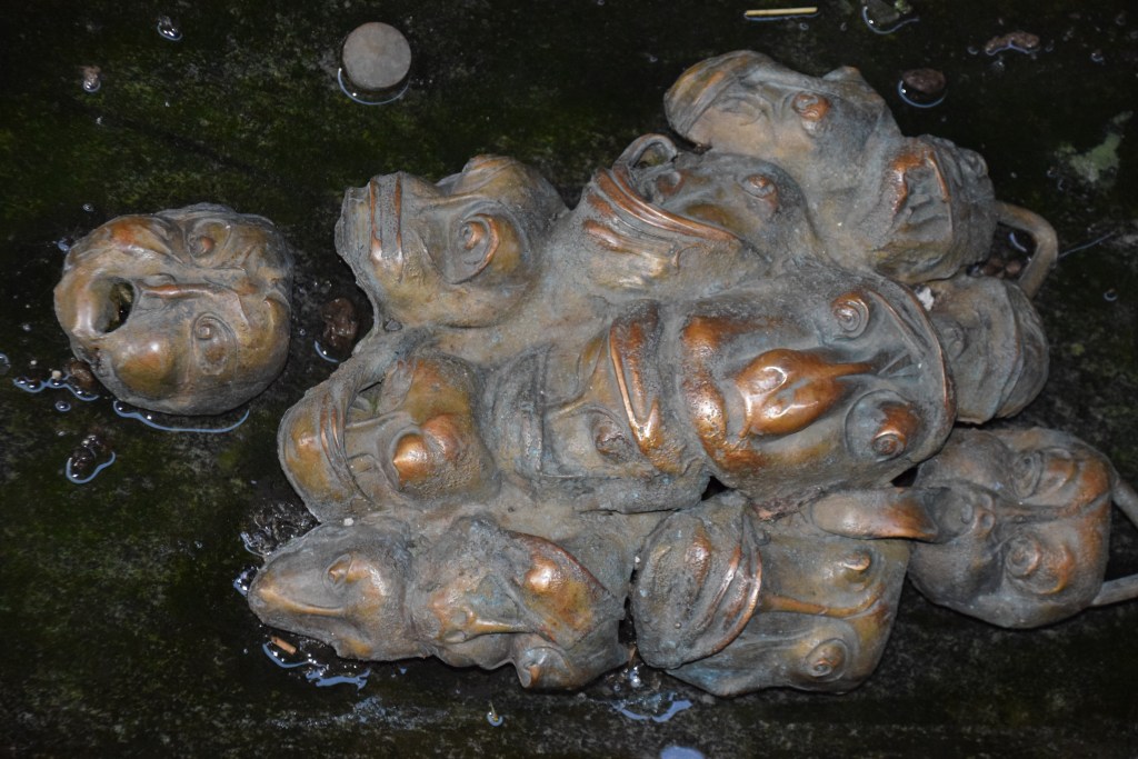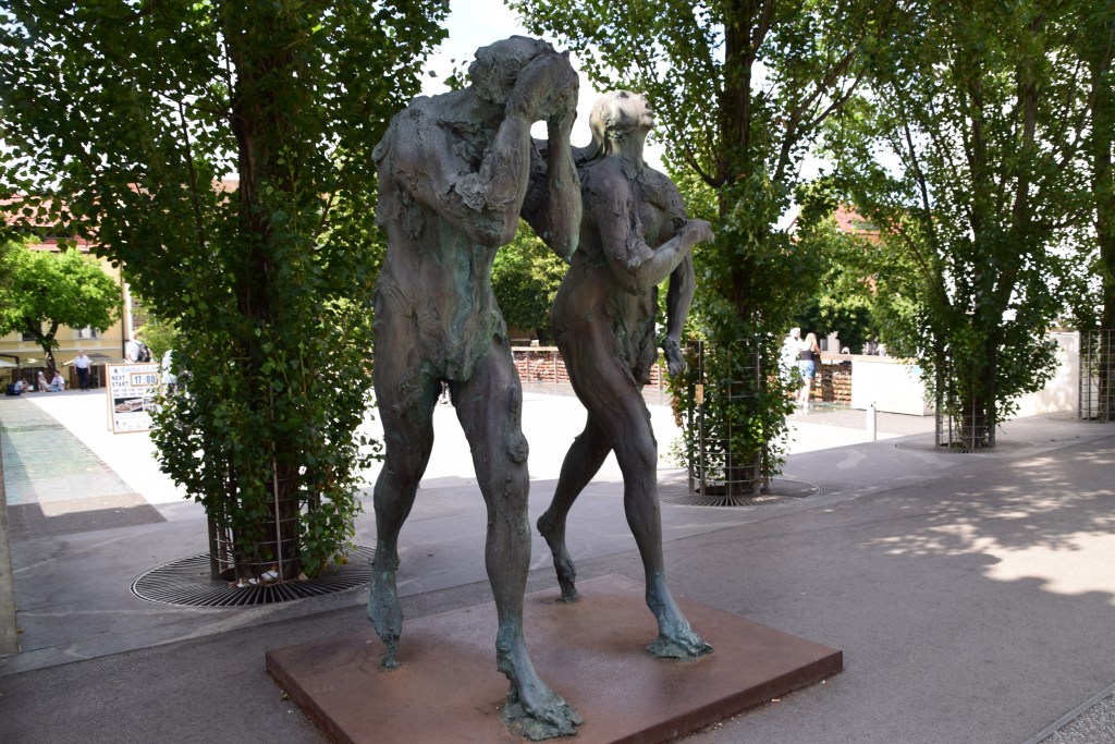 A gully runs the length of the alley and is filled with strange little bronze faces – 700 to be exact! Some are happy, some sad, but all rather disturbing! This is the work of our friend Jakov Brdar – remember his sculptures on Butcher’s Bridge? He was influenced by a piece written by Austrian poet Rainer Maria Rilke. ……