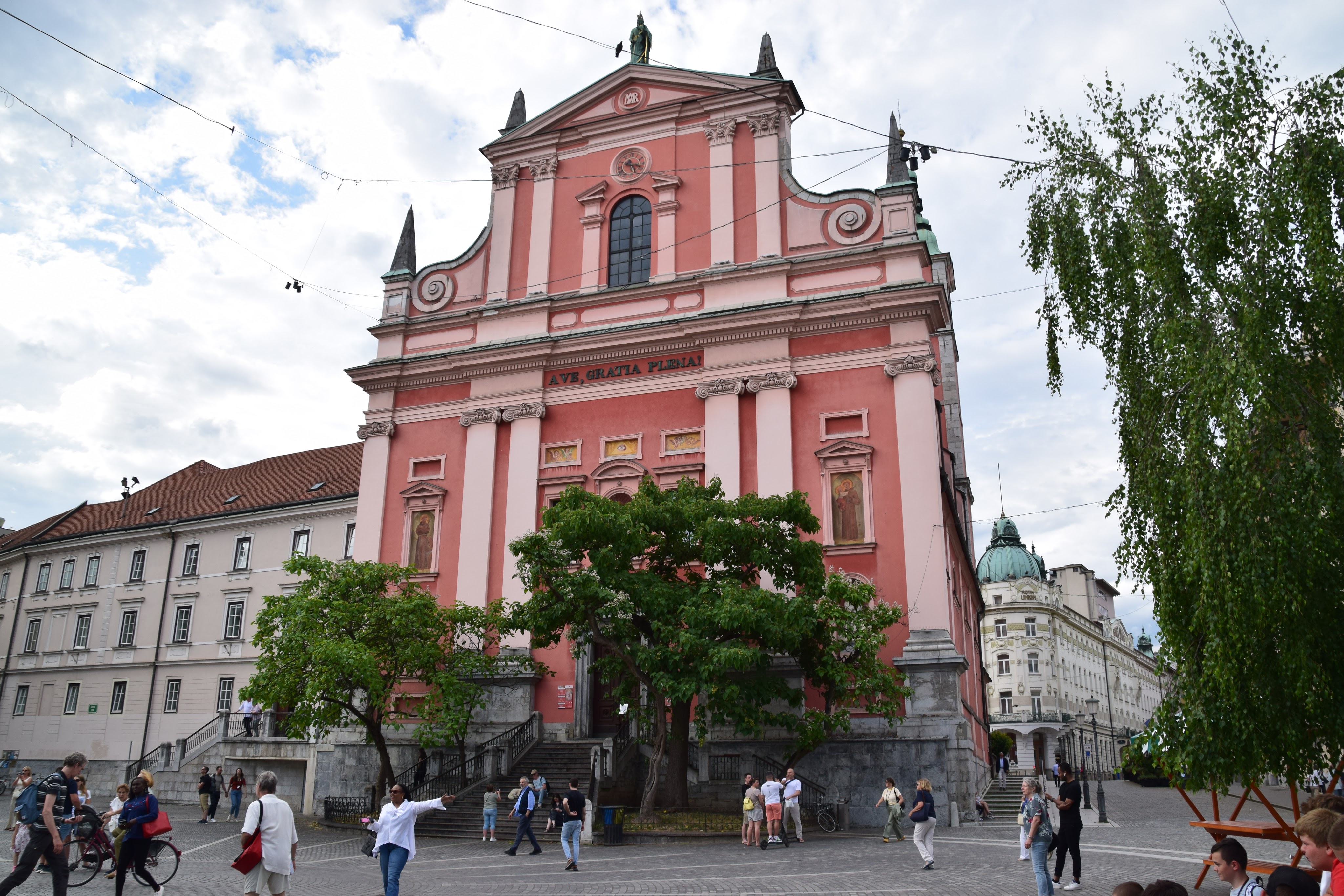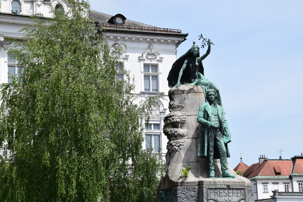 We’ll start at Prešernov trg – the heart of the city. You can’t miss the striking red exterior of the 17th century Franciscan Church. The square is named after the great Slovenian poet, France Prešeren (1800-1849). When his statue was unveiled in 1905, the clergy in the nearby church were horrified at the naked muse of poetry holding a laurel wreath above his head! The solution? The planting of birch trees to strategically block the view of the muse from the church entrance!