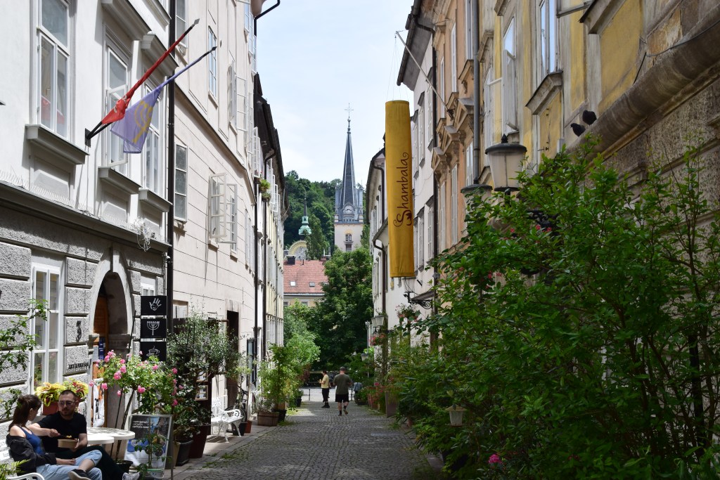 We cross the river again and wander up Križevniška ulica – a small street with flower pots, ivy covering façades, and benches, inscribed with quotes, inviting you to sit and relax.
