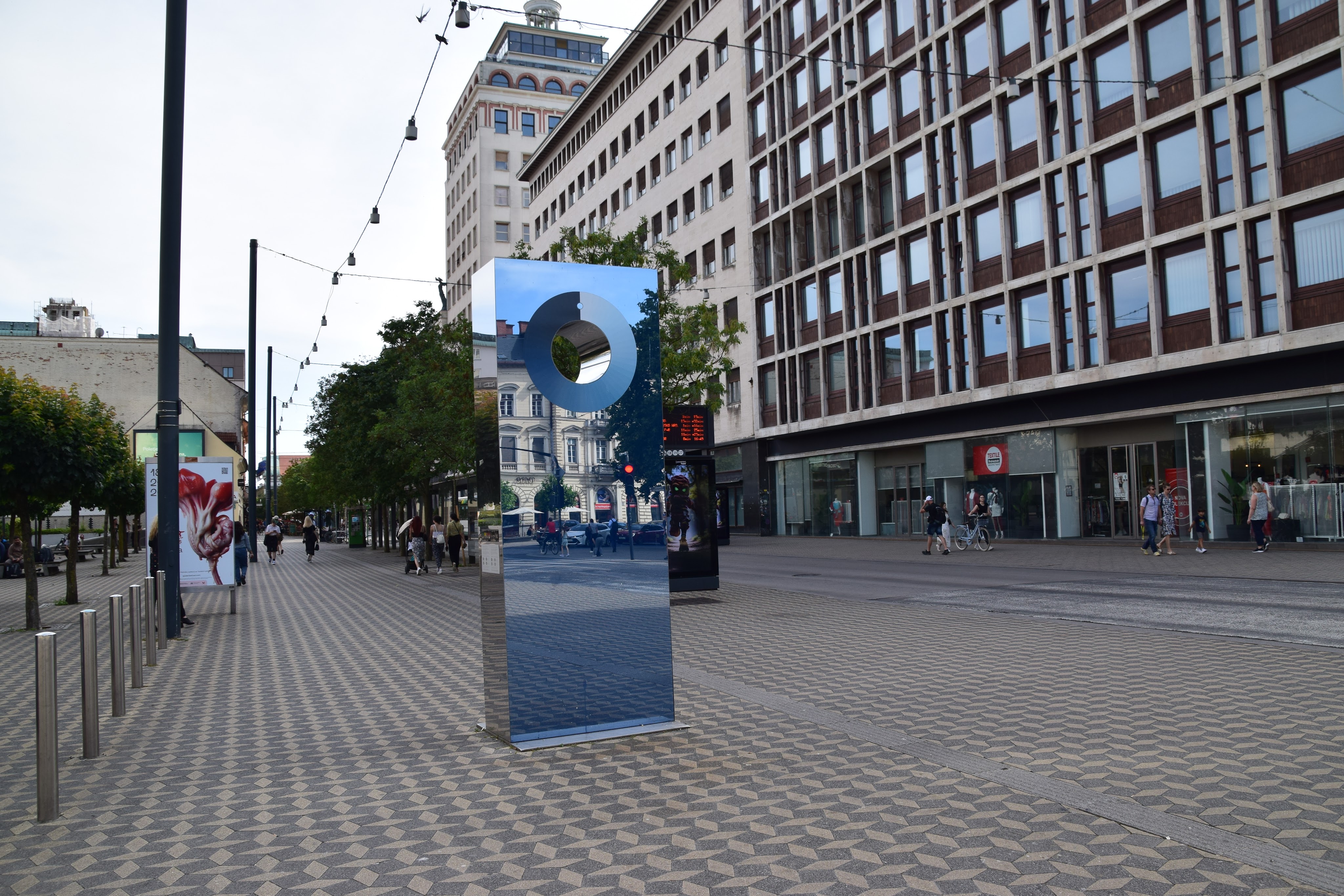 Nearby is a bronze gutter grate with a sentence from Ulysses printed in Slovenian and in English: V polkrogu je zavrtel ogledalo po zraku, da razpošlje to novico v soncu, ki je zdaj zarelo nad morjem. / He swept the mirror a half circle in the air to flash the tidings abroad in sunlight now radiant on the sea.