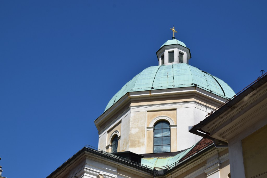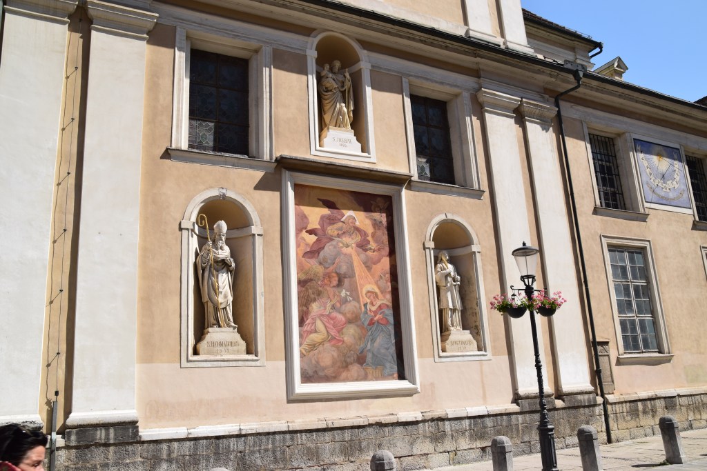 Saint Nicholas’s Cathedral is right next to the food market. You’re not going to miss it – the green dome can be seen for miles around. It’s worth having a look at the Baroque interior and the frescos but, if you can’t get inside, at least make sure to stop at the huge bronze doors which were designed for Pope John Paul II’s visit in 1996. One features the pope himself, looking down upon the history of Christianity in Slovenia. The other shows six bishops of the twentieth century standing over the enshrouded body of Christ